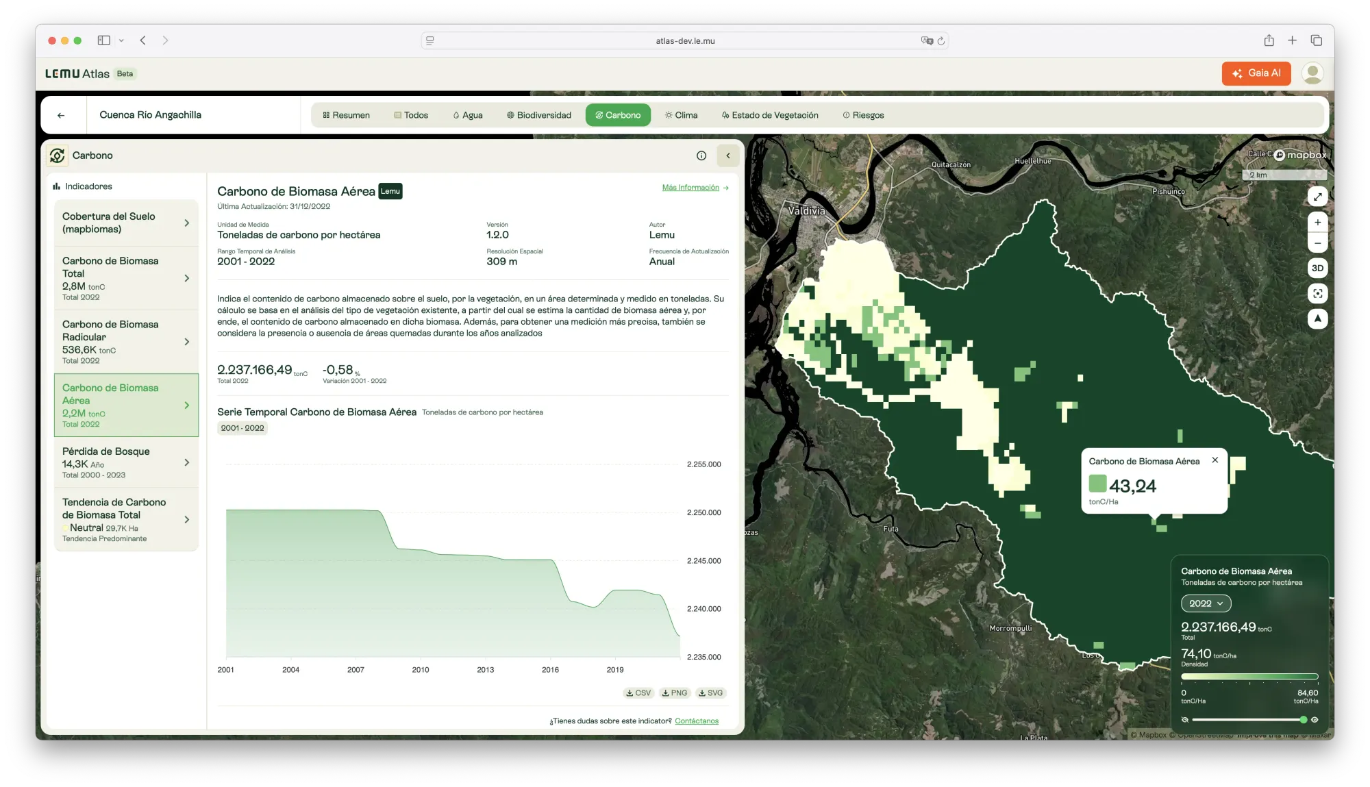 Atlas helps you track Red List Species Presence, monitor NDVI trends, or quantify biomass carbon — translating raw data into actionable insight for decision-making.
